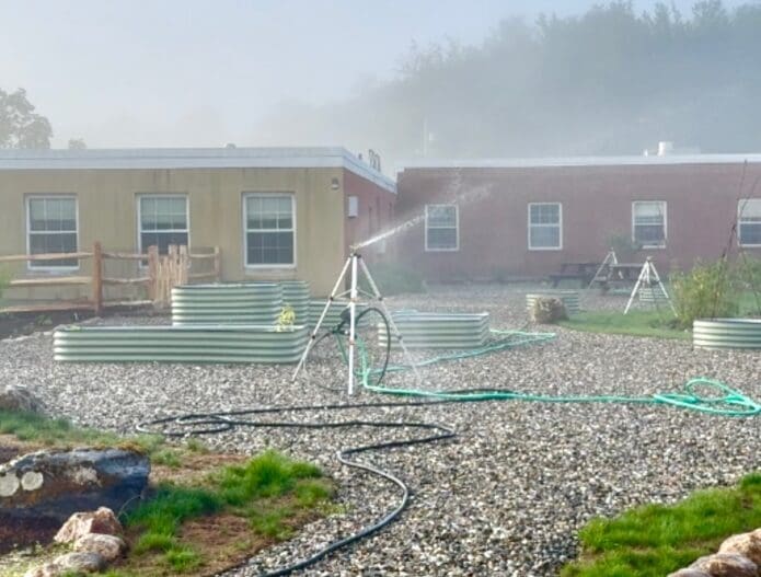 Thoughtful infrastructure: automatic irrigation on timers and micro-emitters in raised beds to keep plants healthy; shrubs sited to screen utilities over time; a cold frame planned for seedlings; a future tool shed to support ongoing classroom use.